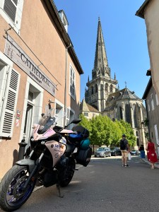 Seguo i cartelli per il centre ville e, non trovando divieti, mi ritrovo proprio nella piazza davanti alla cattedrale. La costeggio lentamente in moto, ammirandone la facciata, poi continuo tra le strette vie del borgo.